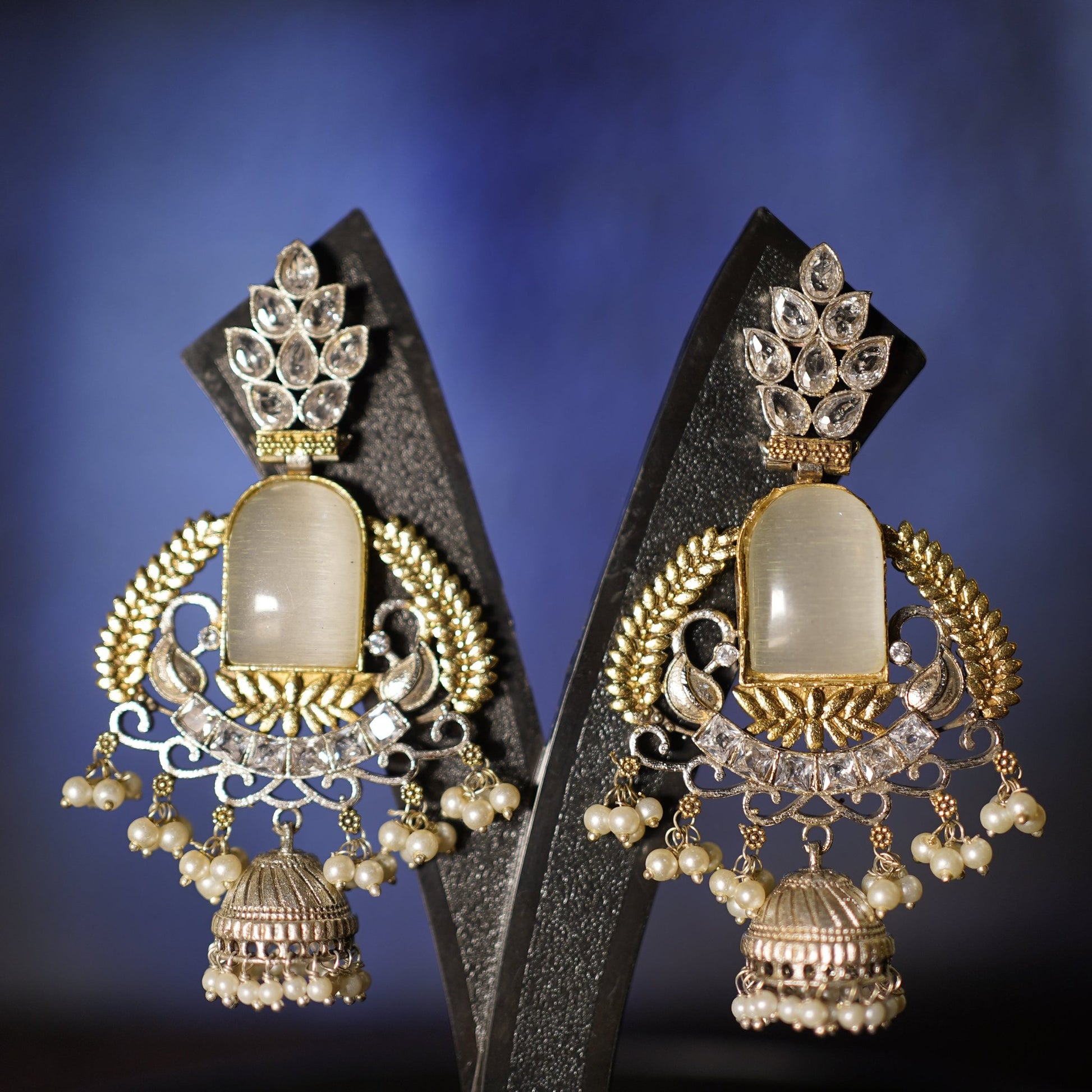 The Pavilion Off-White Stone Earring Set showcases a delicate floral top design paired with a white pearl drop and gold leaf accents. This enchanting set brings a touch of nature-inspired beauty, perfect for enhancing your style at any gathering or celebration