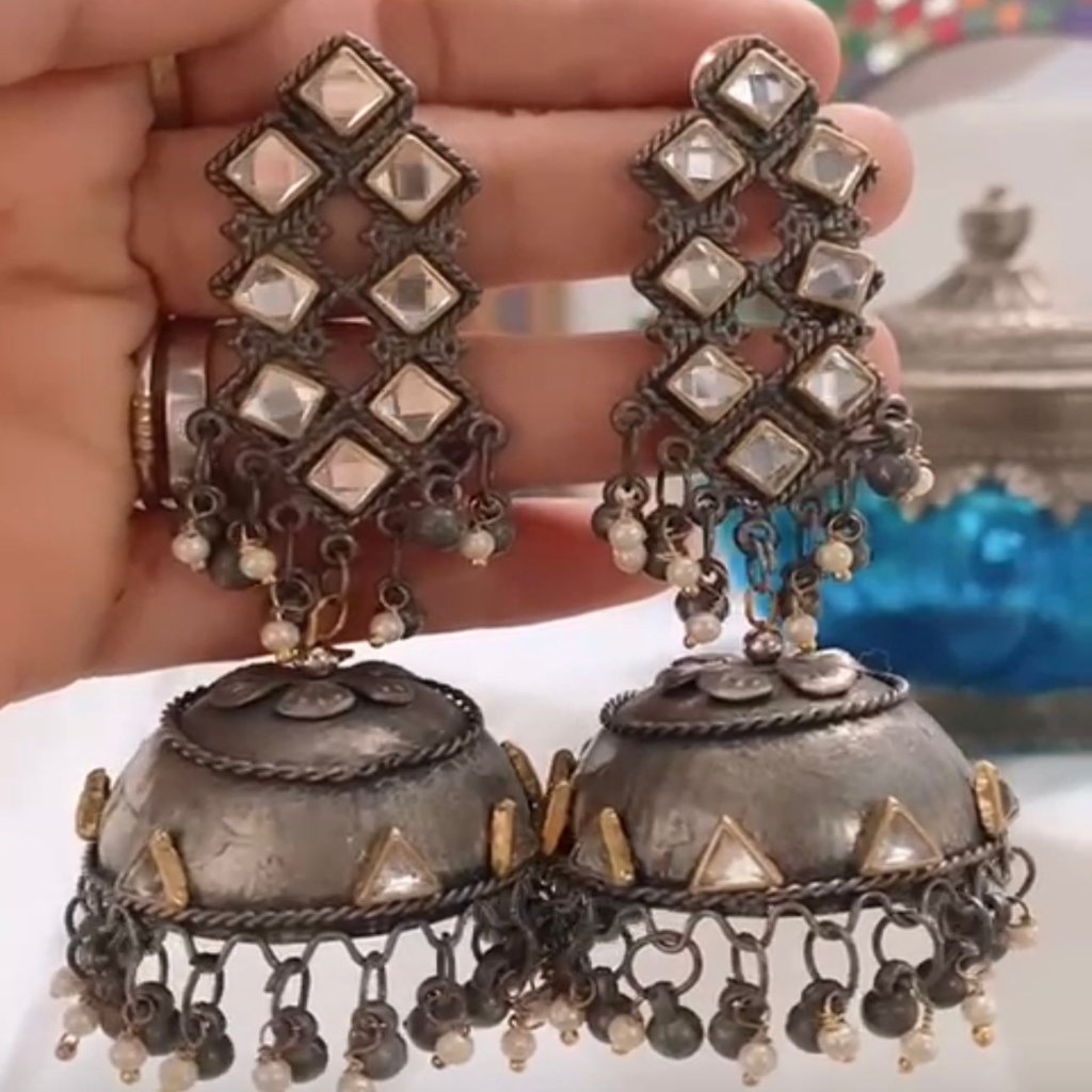 Riva German Silver Mirror Jhumkas bring together intricate silver craftsmanship and stunning mirror accents. These bold, dangling jhumkas offer a perfect balance of elegance and statement style, ideal for festive occasions or adding a traditional touch to everyday outfits.