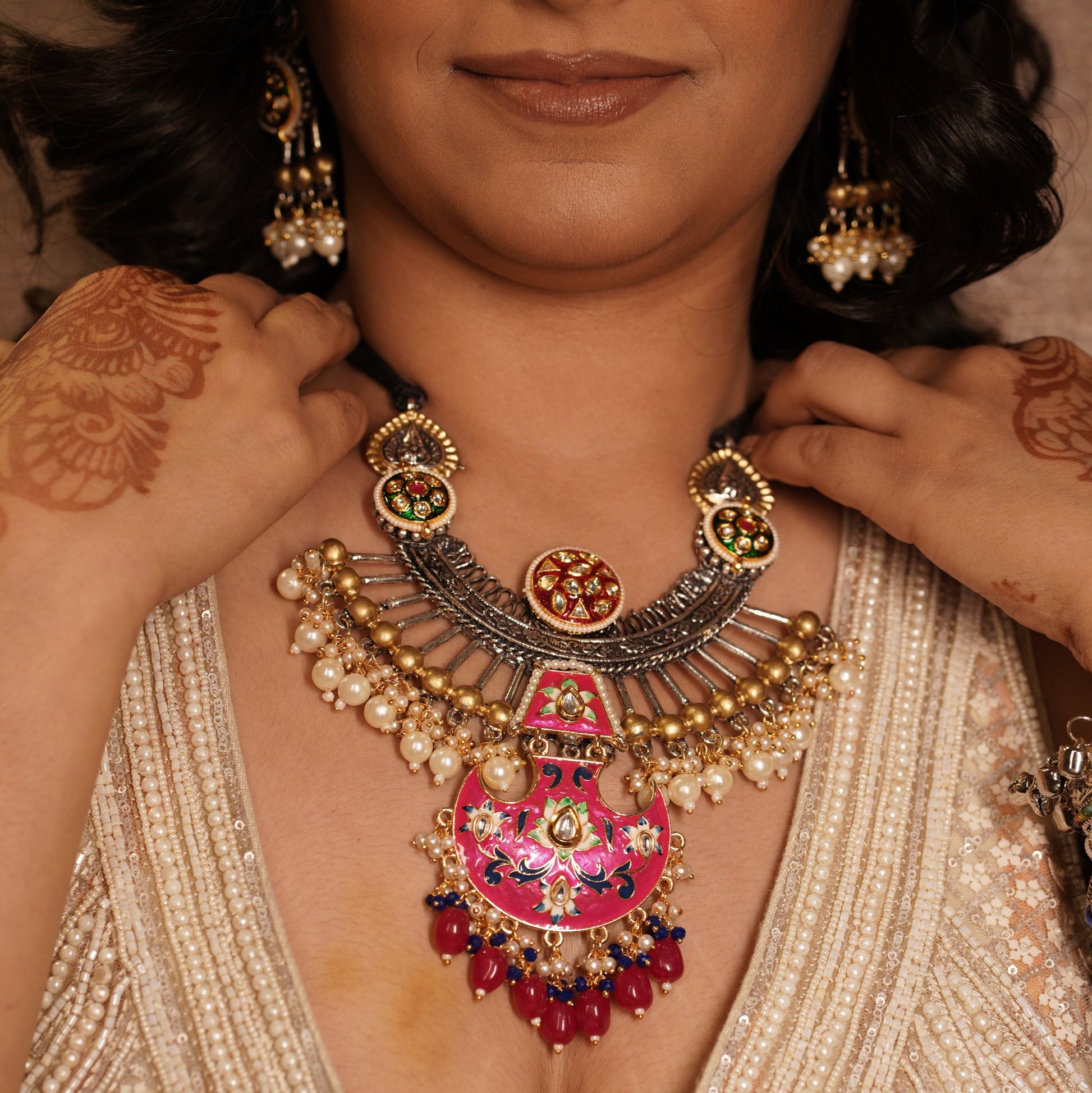 Shree Chokar Necklace | Fusion of Silver and Gold-Plated Design | Meenakari and Kundan
