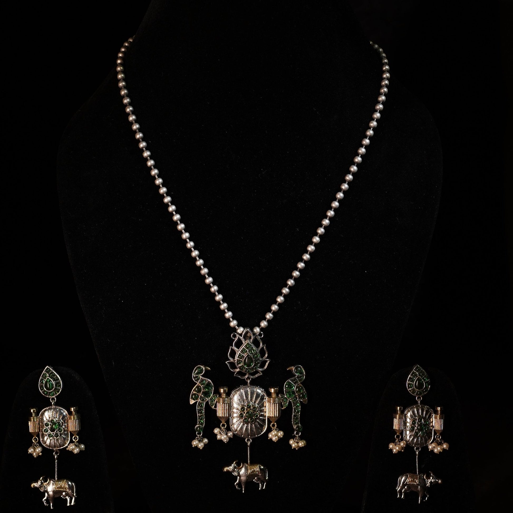 This contemporary silver chain, finished with gold plating, features a small emerald green imitation stone and a sacred cow charm, adding a touch of heritage. The matching earrings complete the look, making it perfect for modern, elegant styling. Pair it with both ethnic and western wear for a versatile, chic ensemble.